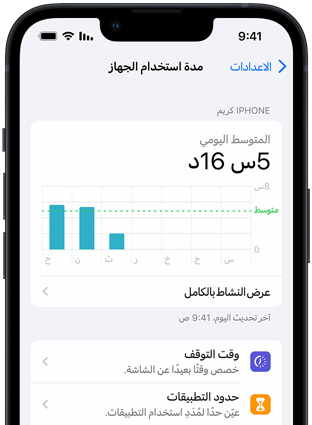 تسمح لك ميزة مدة استخدام الجهاز بتحديد مقدار الوقت الذي يمكنك أنت وأبناءك قضاؤه كل يوم على تطبيقات ومواقع ويب محددة. ويمكنك وضع استثناءات لتطبيقات معينة مثل تطبيق الرسائل أو التطبيقات التعليمية، كما يستطيع أبناؤك أن يطلبوا منك الموافقة على منحهم وقتاً إضافياً عندما يرغبون في ذلك.