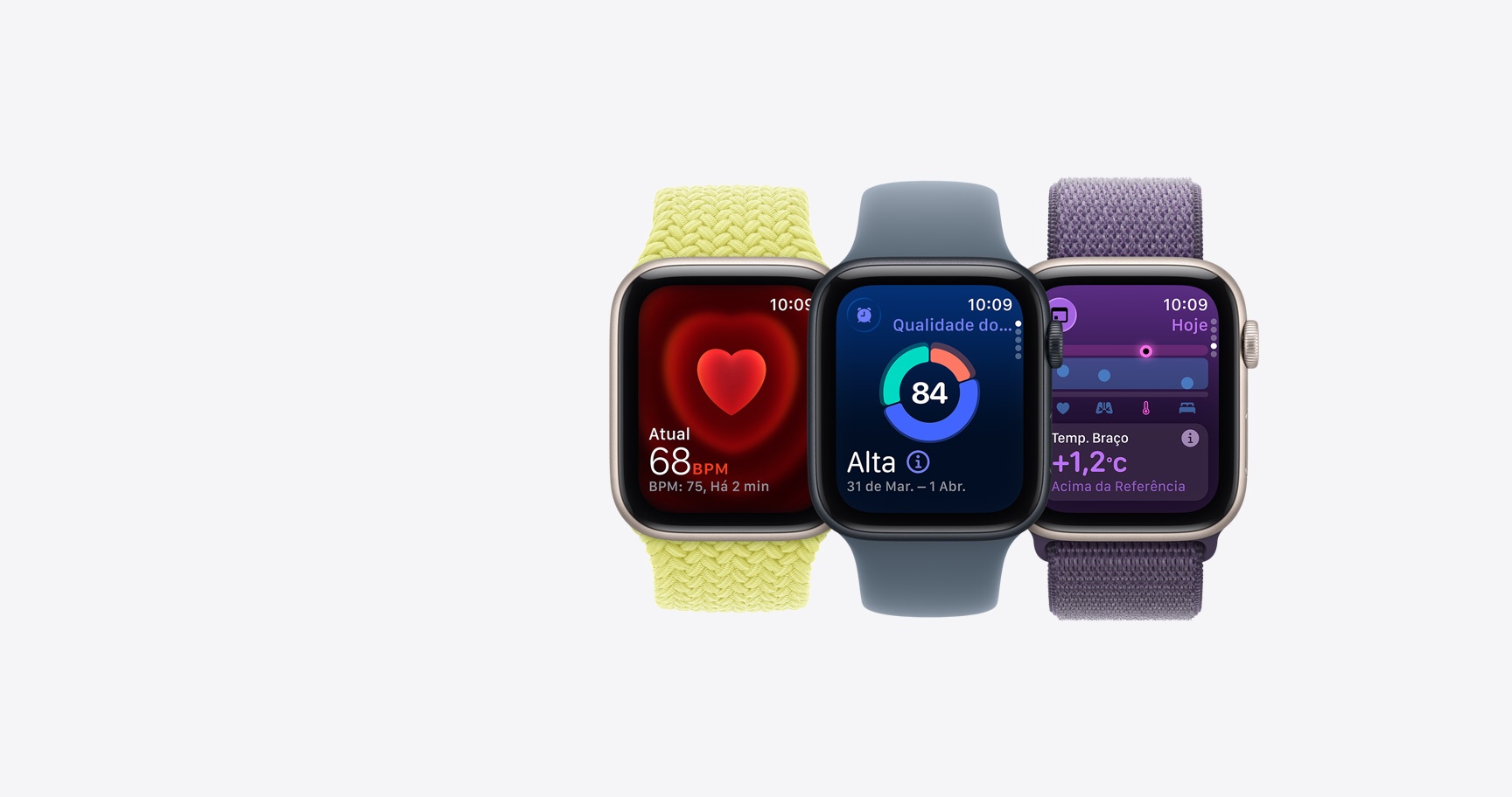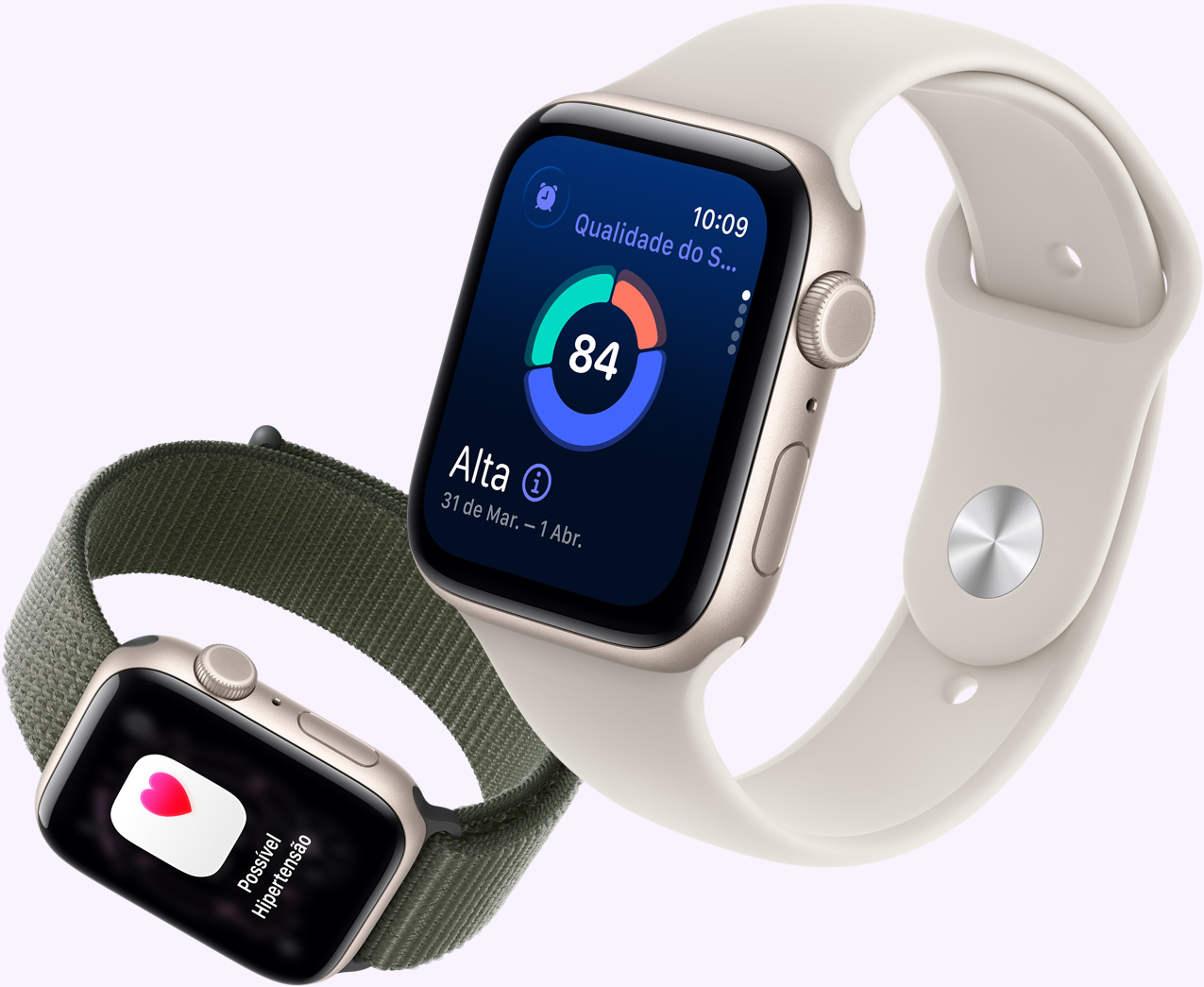 Relógios Apple Watch SE 3 com caixas de alumínio disponíveis nas cores estelar e meia-noite mostrando apps como Sinais Vitais, Batimentos, Qualidade do Sono, círculos de Atividade e uma chamada recebida