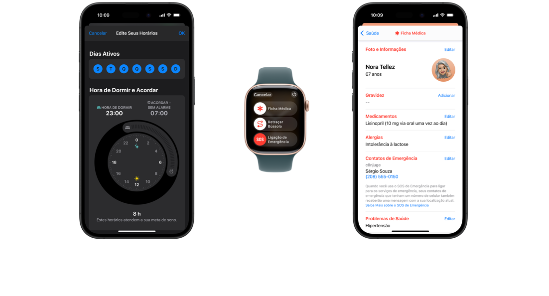 Equipes de resgate podem acessar sua Ficha Médica rapidamente no iPhone ou no Apple Watch para ver informações importantes, como alergias, tipo sanguíneo, contatos de emergência e muito mais.