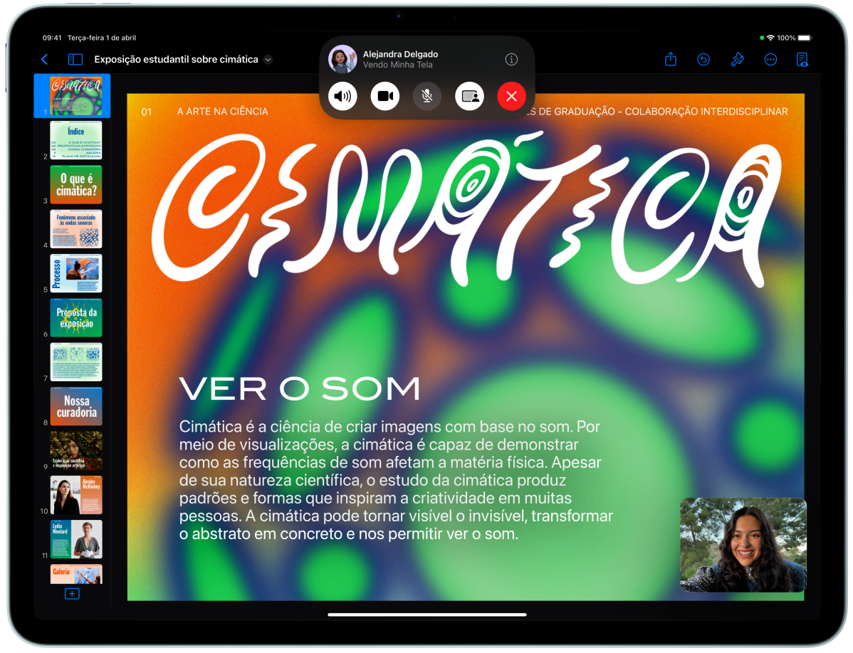Parte da frente do iPad Air. A tela mostra um usuário participando de uma chamada FaceTime e vendo um Keynote. Atrás está a parte de trás de outro iPad Air.