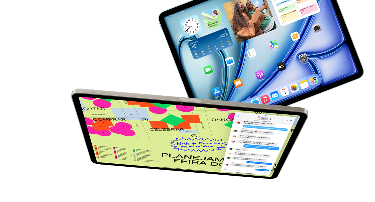 Escolha entre dois modelos de iPad Air: 11 ou 13 polegadas. Ambos têm tela Liquid Retina de alta resolução para dar vida a tudo o que você gosta de fazer. As telas são brilhantes, responsivas e oferecem uma precisão de cores excelente.