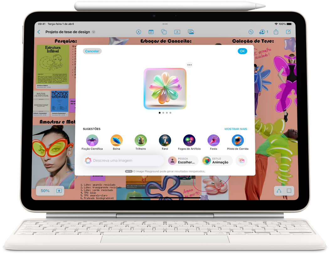 A Apple Intelligence possibilita se expressar visualmente de um jeito divertido. Transforme um rascunho em uma imagem relacionada com a Varinha Gráfica. E, com o Image Playground, crie imagens únicas com base em descrições, sugestões de conceitos ou até em uma pessoa da sua Fototeca.
