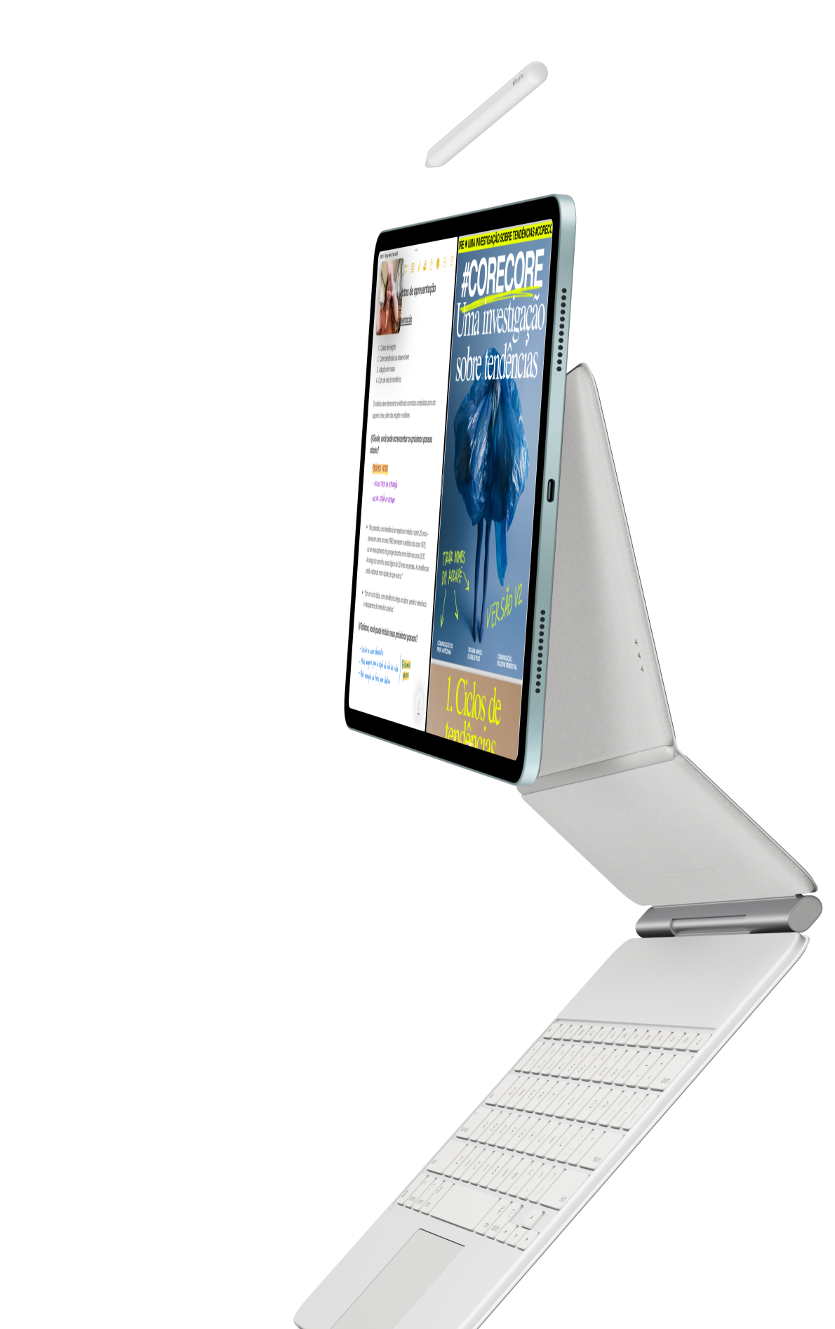 O Magic Keyboard é o parceiro ideal do iPad Air. Ele reúne uma ótima experiência de digitação e um trackpad para tarefas de precisão em um design elegante e portátil. O teclado inclui 14 teclas de função e um conector USB-C para recarga, além de proteção para a parte da frente e de trás do seu iPad Air. O sistema articulado suspenso se ajusta a diversos ângulos de visão e o amplo trackpad em vidro aumenta as formas de trabalhar no iPadOS3.