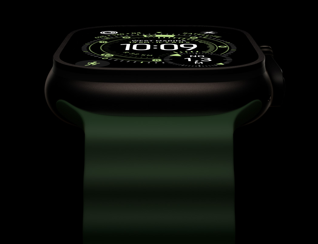 Apple Watch Ultra 3, boîtier en titane, naturel, boussole sur le cadran Orientation, bracelet Océan, vert fluo