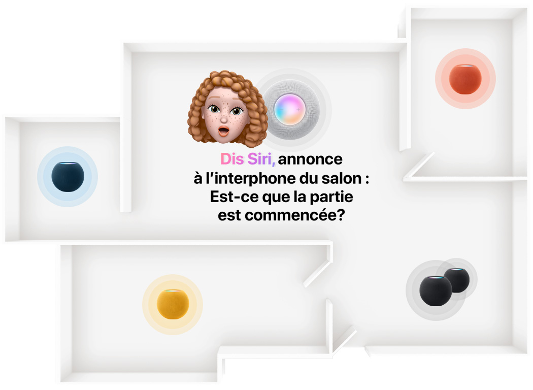Plan d’une maison. Un HomePod ou un HomePod mini se trouve dans chaque pièce. Un Memoji parle. Des haut-parleurs sont mis en évidence.