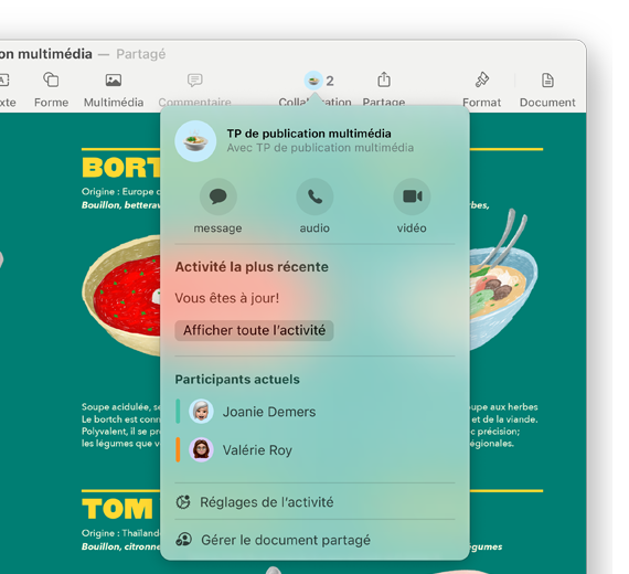 Collaborez facilement. Où que vous soyez, partagez un lien privé vers vos fichiers, dossiers, documents et contenus de toutes sortes. Vous décidez qui peut consulter le projet, le modifier ou le partager. Et comme tout s’actualise en temps réel, vous voyez le résultat dès que quelqu’un apporte un changement.