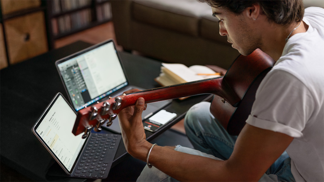 Como cantante y compositor, Max dice que hay que estar preparado para cuando llega la inspiración. Con Notas de Voz en el iPhone captura al instante ideas para canciones y luego las hace realidad en su Mac con distintos arreglos.