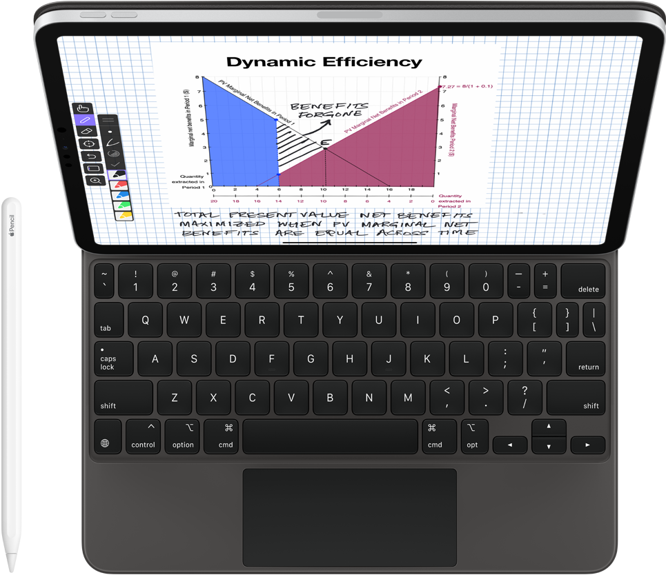 La Dra. Gopalakrishnan usa la app Explain Everything Whiteboard en el iPad para grabar sus clases de Economía Medioambiental, desglosar tablas y gráficos abstractos, y enseñar a sus alumnos a resolver problemas matemáticos complejos en tiempo real.