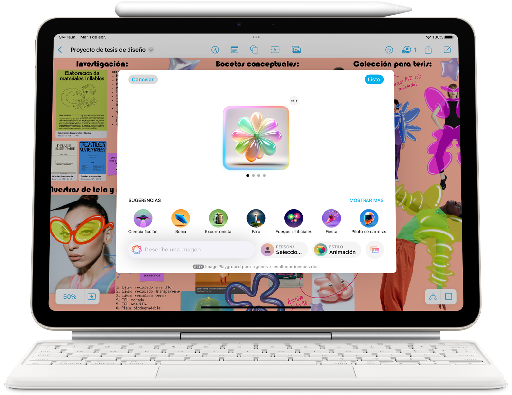 Apple Intelligence te ofrece formas espectaculares de expresarte visualmente. Usa Imagen Mágica para convertir un boceto en la ilustración perfecta que complemente tus notas. Y crea imágenes nuevas basadas en descripciones, conceptos sugeridos o incluso una persona de tu fototeca con Image Playground.