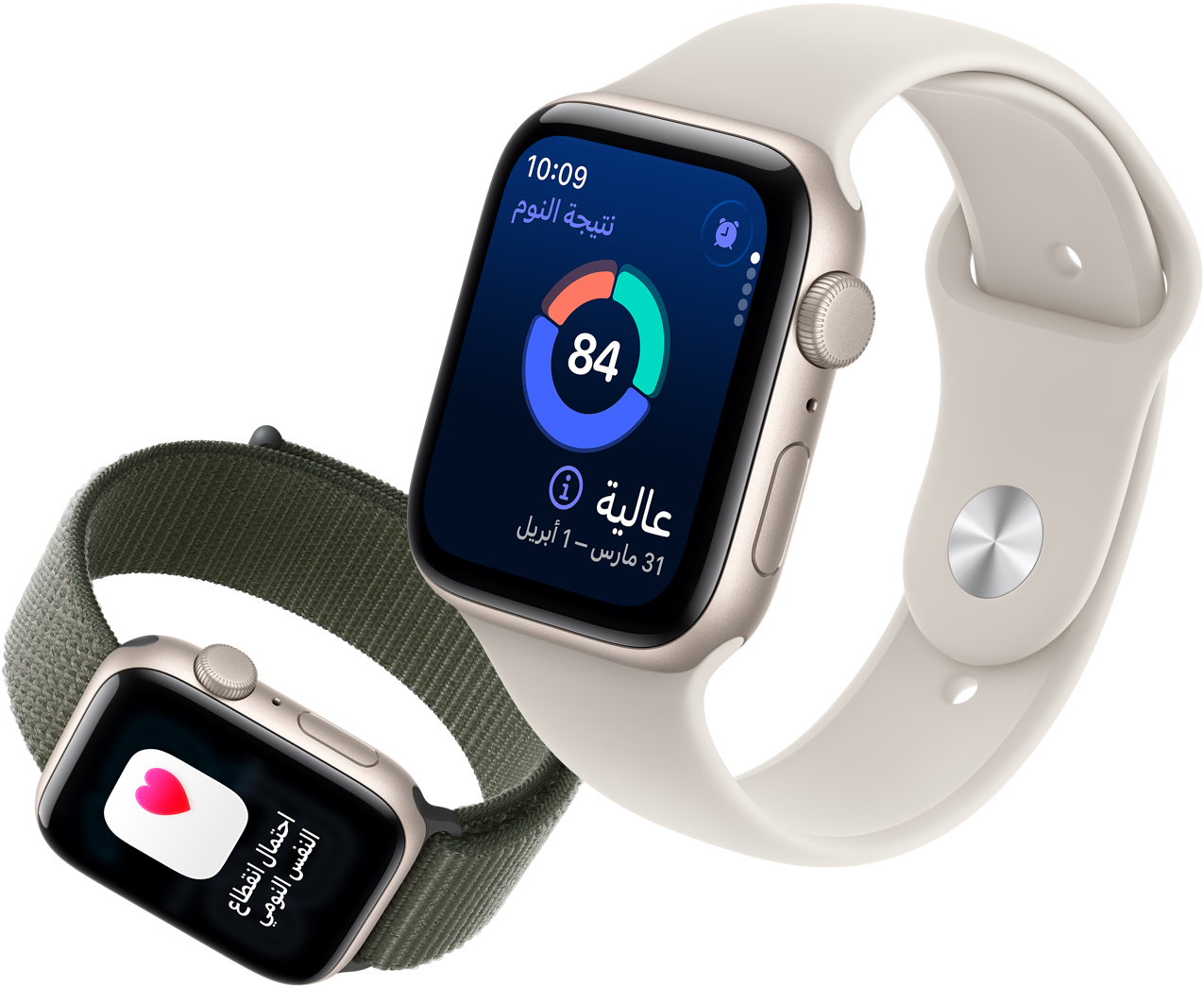 Apple Watch SE 3 بإطارات ألومنيوم متوفرة بلون ضوء النجوم وسماء الليل، تعرض تطبيقات مثل تطبيق العلامات الحيوية ومعدل نبض القلب وميزة نتيجة النوم وحلقات النشاط ومكالمة واردة
