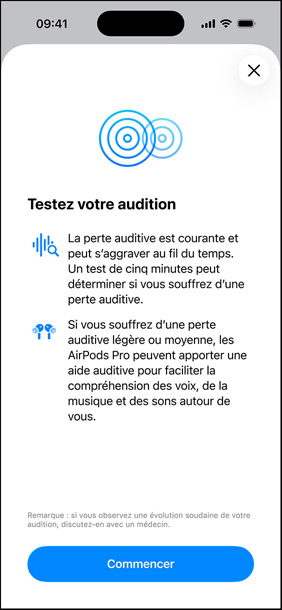 Tout est privé, sécurisé et facile à gérer. Les données de votre Test d’audition restent privées et sont stockées en toute sécurité dans l’app Santé de votre appareil. À tout moment, vous pouvez repasser le test, en télécharger les résultats, surveiller votre audition et lire des articles sur la santé auditive.