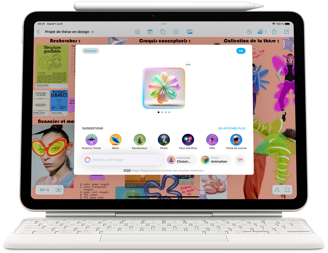 iPad Air en mode paysage présentant Apple Intelligence avec Image Playground, et Keynote, Apple Pencil Pro
