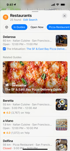 揀個目的地,其互動地點卡就會顯示你所需的各種資訊,內容一目了然。除了地址、營業時間、網站和電話號碼等基本資料,你還可進一步查看價格範圍、相片圖庫、相關的指南、可用的付款類型,甚至是否可帶同愛犬前往。使用航覽或環視四周功能,就能看看目的地及其周遭環境。你只要點按一下,更可快捷安全地租架單車、泊車繳費和點餐等。