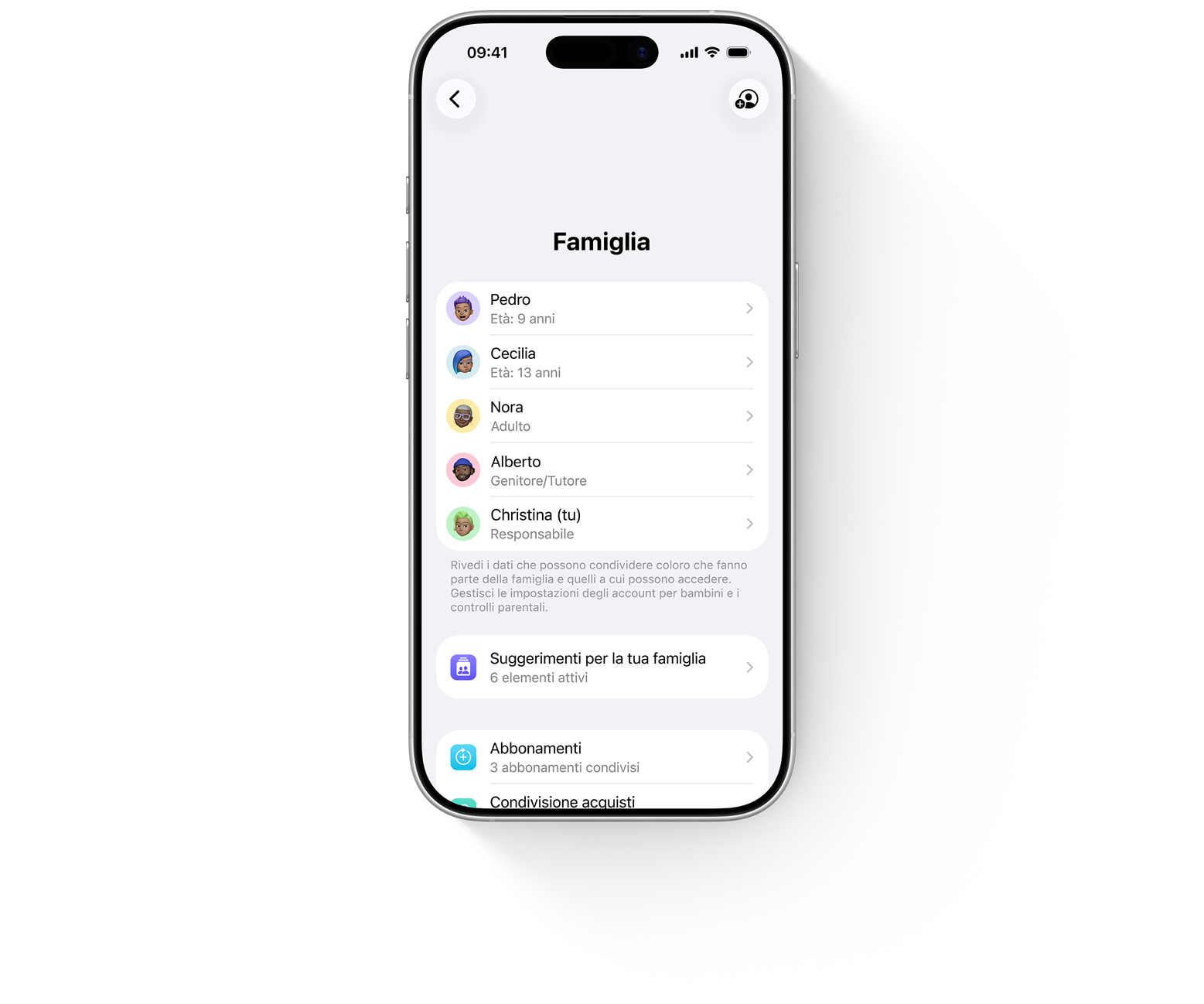 • Per indicazioni su come usare al meglio le funzioni per la famiglia, apri Impostazioni, tocca il tuo nome, quindi seleziona Famiglia e poi “Suggerimenti per la tua famiglia”.