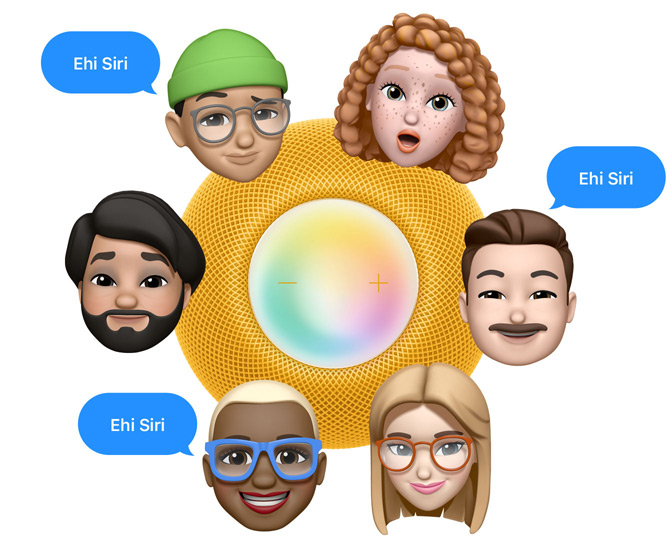 Sei Memoji disposte in cerchio intorno a un HomePod mini giallo visto dall’alto. Accanto a tre Memoji ci sono dei fumetti blu che dicono “Ehi Siri”.