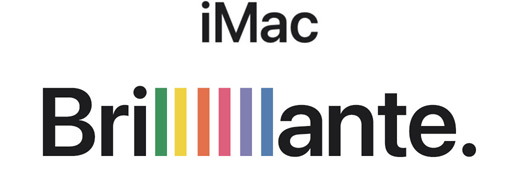 Sette iMac nei colori verde, giallo, arancione, rosso, viola, blu e argento disposti a fisarmonica