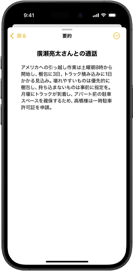 長い留守番電話の内容を短くしたり、メモや録音した通話の内容を要約したり、メールアプリで1回タップするだけでEメールを要約できます。