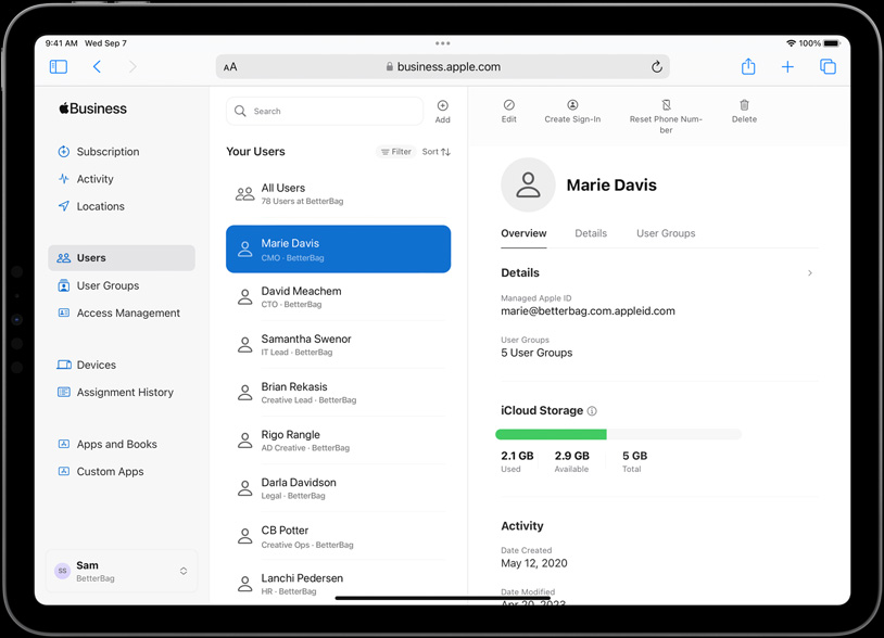 Apple Business Managerは無料で使えるウェブベースのポータルで、IT部門はどこからでも安全にデバイスの設定やアプリの配布ができます。IT部門は、ユーザーの管理対象Apple IDの作成、新しいデバイスの割り当て、アプリの一括購入と配布ができ