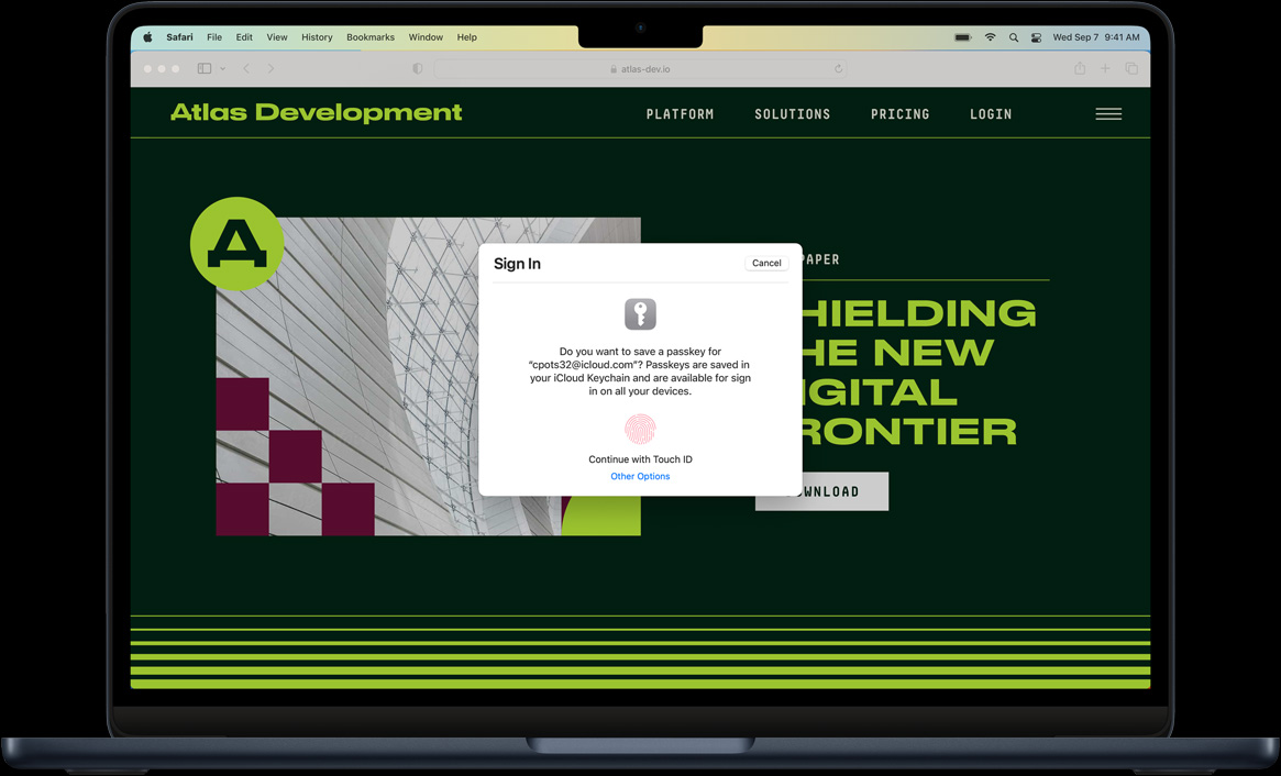 Apple製デバイスには、セキュア認証のためのシングルサインオンのフレームワークが組み込まれています。ユーザーは1回サインインするだけで、MacでTouch IDを使って、会社のすべてのアプリとウェブサイトにアクセスできます。シングルサインオンは一般的なID管理ソリューションと統合されているので、ビジネス全体の認証がシンプルになります。