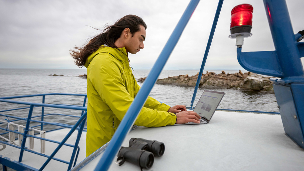 Appleのテクノロジーは、Bodhiさんの大学での研究活動や、その成果をまとめることにも役立っています。例えばセイリッシュ海を通航する船舶が、絶滅危惧種のサザンレジデントシャチの個体数に及ぼす影響を示すという研究では、MacBook AirとiPhone、そして双眼鏡を手に海上でのフィールドワークに取り組んでいます。NumbersとKeynoteでシャチの観測情報を図表化し、フローチャートと個体群密度のマップを作成してフェリーの航路と重なる場所を明らかにすることで、そこに生息するシャチの個体数に悪影響を及ぼす可能性のある活動を特定しようとしています。そしてiPhoneを使って説得力のある写真やビデオを撮影し、調査結果を記録してい