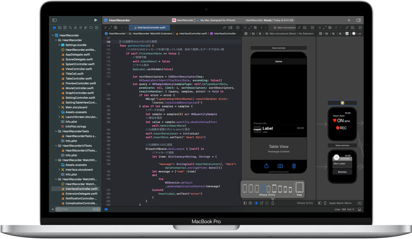 MacBook Pro. HealthKit이 설치된 Mac의 Xcode 및 Swift도 Iimura 박사 팀의 솔루션 개발에 큰 힘이 되어줍니다. 학생들이 다양한 활동을 하는 동안 그들의 실시간 심박수와 신체 반응 정보를 포착하고 기록해 주는 일을 서로 연동해서 수행하는 iOS 앱과 watchOS 앱처럼 말이죠.