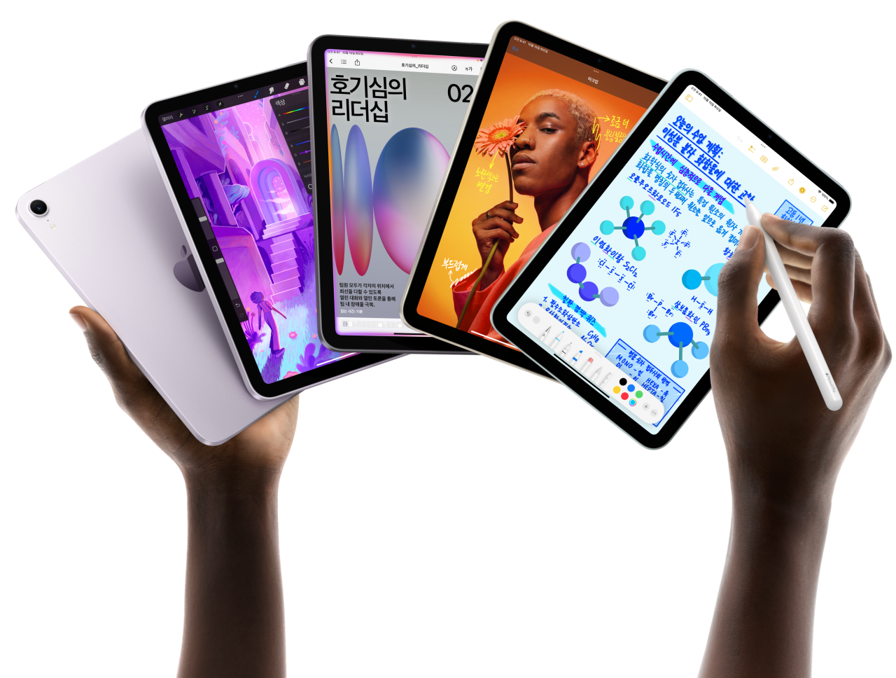 Apple Pencil은 그림을 그리고, 손글씨를 쓰고, 필기를 하는 행위가 어떤 느낌으로 이루어져야 하는지에 대한 기준을 제시합니다. 직관적이고, 정밀하면서도 사뭇 신기롭죠.2 픽셀 단위의 정밀함과 극히 짧은 지연 시간, 기울기 감지 기능, 팜리젝션 기능까지 갖췄답니다. Apple Pencil Pro는 여기에 더욱더 많은 기능을 더해 전에 없던 방식으로 당신의 아이디어에 생명을 불어넣을 수 있게 해줍니다.