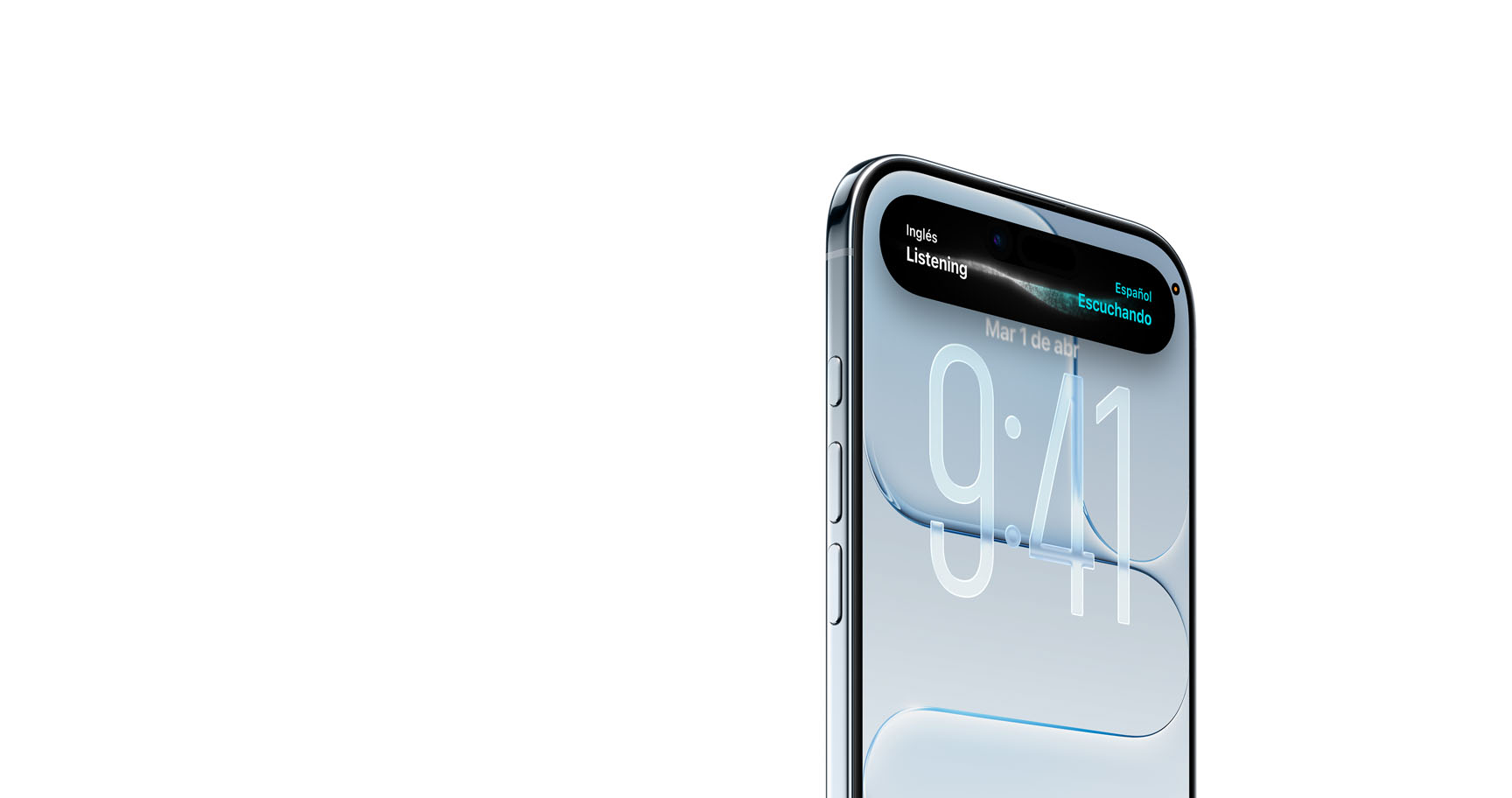 Una mano sostiene un iPhone Air, parte frontal, parte lateral, color azul cielo, perfil muy delgado, Dynamic Island, botones: lateral, Control de la Cámara