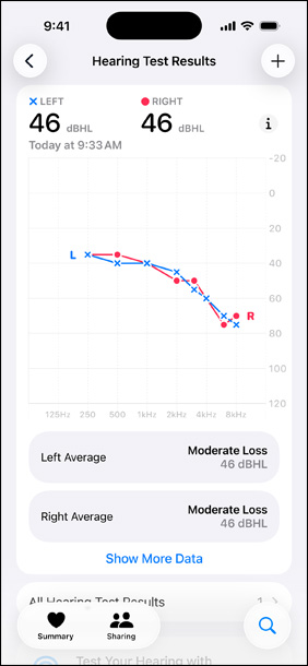 Tout est privé, sécurisé et facile à gérer. Les données de votre Test d’audition restent privées et sont stockées en toute sécurité dans l’app Santé de votre appareil. À tout moment, vous pouvez repasser le test, en télécharger les résultats, surveiller votre audition et lire des articles sur la santé auditive.