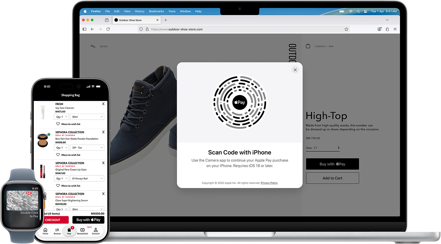 In apps and online. Use Apple Pay to seamlessly make purchases in Safari and other browsers — on iPhone, iPad, Mac and other computers — without the lengthy checkout forms. On an Apple device, click or tap the Apple Pay button and pay with a touch or glance. On a non‑Safari browser, scan the Apple Pay code with your iPhone camera and use your iPhone to complete your purchase.2