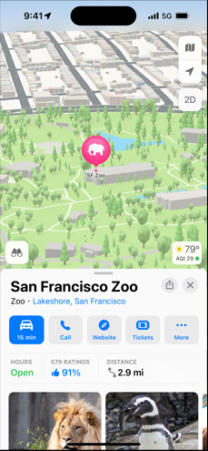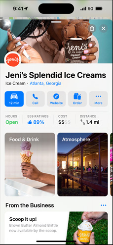 Apple Business Connect ułatwia klientom znalezienie Twojej firmy w apce Mapy. Od Ciebie zależy, co w niej zobaczą. Utwórz wizytówkę, która będzie dostępna na całym świecie dla wszystkich użytkowników urządzeń i apek Apple. Wzbogaconą o wskazówki dojazdu, dane kontaktowe i przydatne opcje.