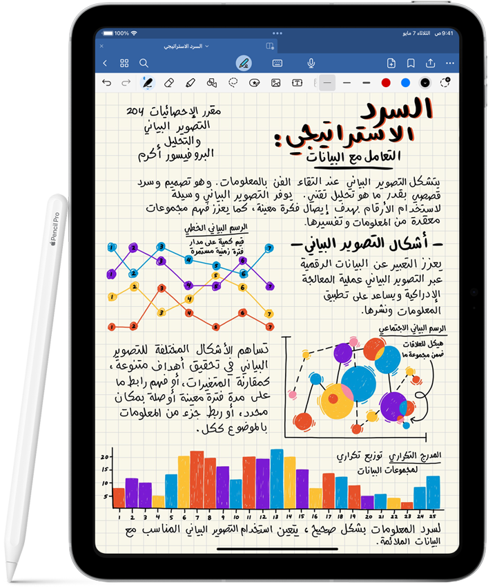 صورة لقلم Apple Pro وقلم Apple ‏‏(USB-C) بجوار أجهزة iPad متعددة تعرض أمثلة لملاحظات مكتوبة بخط اليد ورسومات توضيحية ملونة تم إنشاؤها باستخدام قلم Apple.