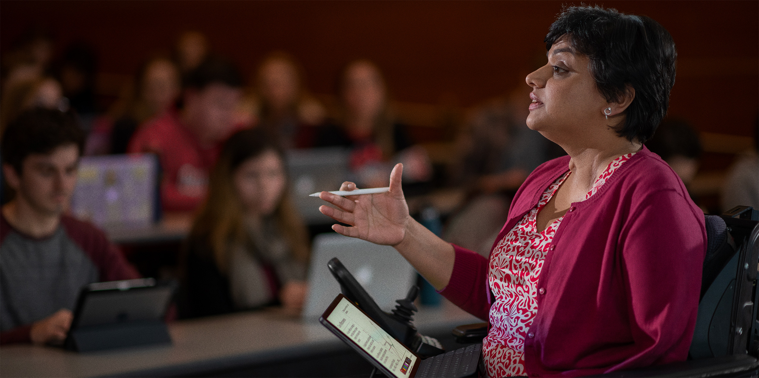 Med hjälp av Apples teknik förvandlar hon sina föreläsningar till en dynamisk tankesmedja. Tack vare diktering, AssistiveTouch och andra inbyggda hjälpmedelsfunktioner på iPad Pro kan dr Gopalakrishnan interagera med och illustrera innehåll i realtid, och Apple Pencil är ett interaktivt allt-i-ett-verktyg som hon använder till att skissa, rita och markera innehåll.