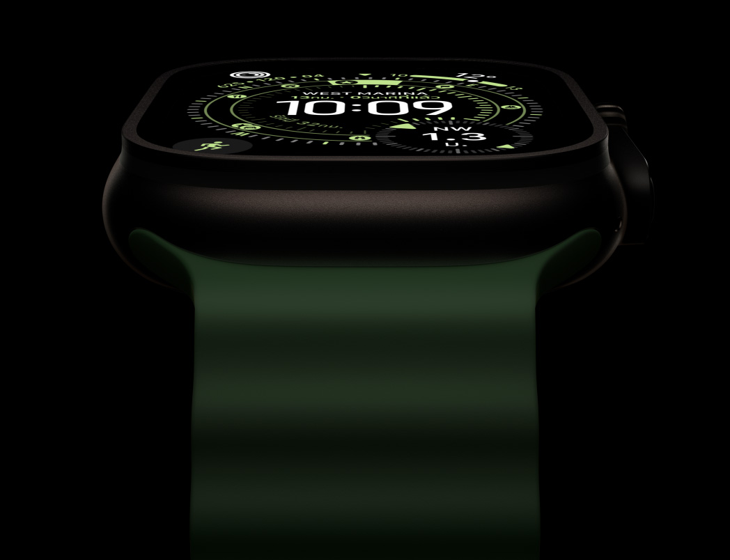 Apple Watch Ultra 3,  titanium case, natural color, compass on Orienteering watch face, Ocean Band, neon green color