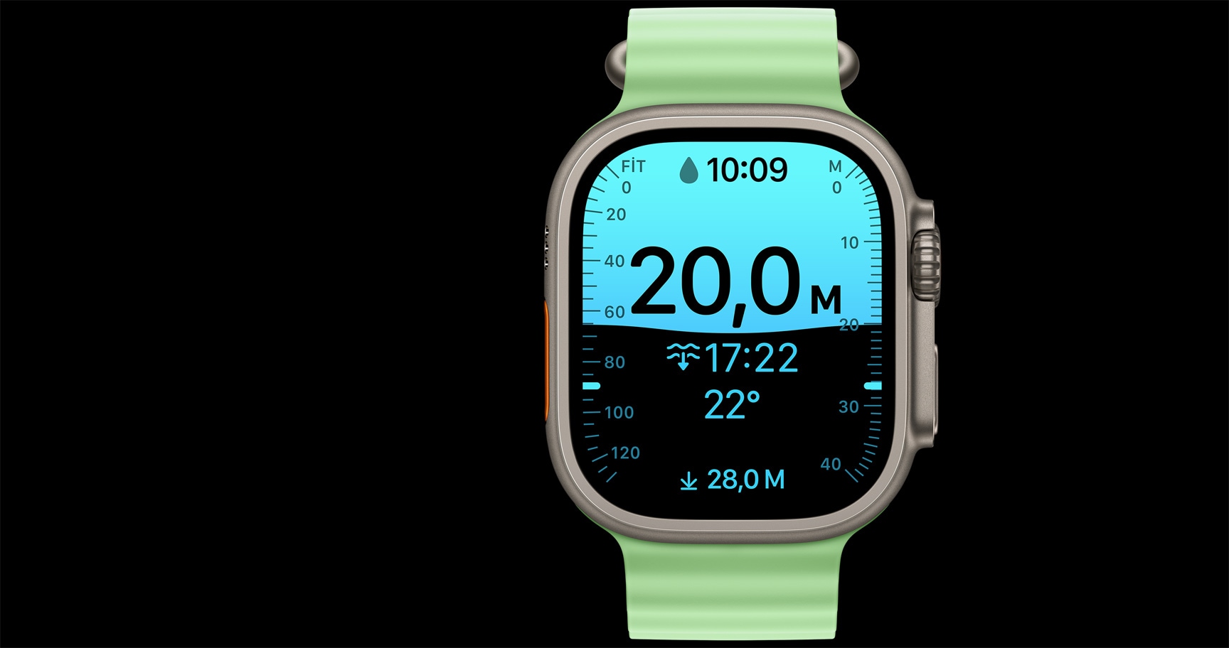Apple Watch Ultra 3, titanyum kasa, natürel renk, Yön Bulma özellikli kadranda pusula, Ocean Kordon, neon yeşil renk