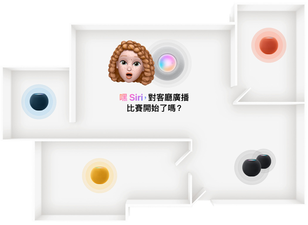 住家平面圖。每個房間都有一部 HomePod 或 HomePod mini。有位 Memoji 角色開口說話。各房間的揚聲器紛紛亮起。