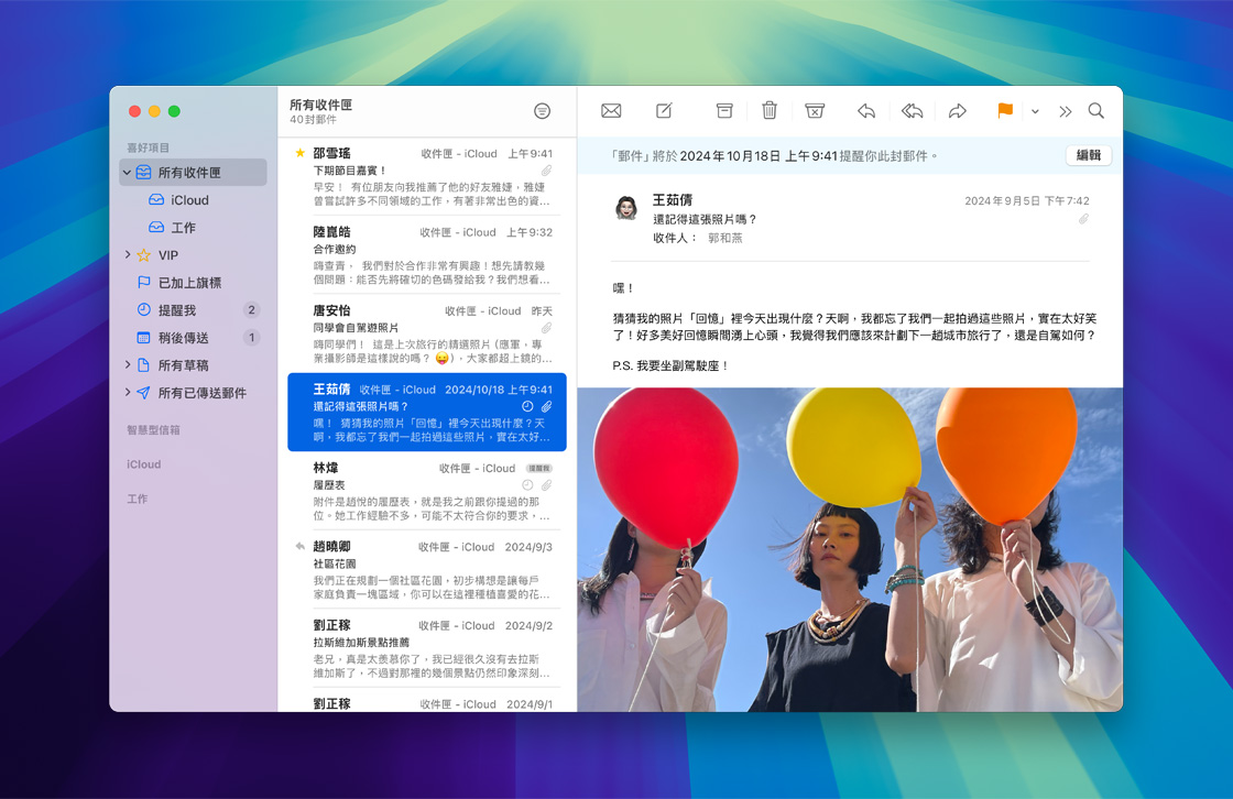 iCloud 郵件與你 iPhone、iPad 或 Mac 上的「郵件」app 無縫整合, iCloud.com 則讓你在任何地方都能輕鬆收發電子郵件。內建垃圾郵件保護與反網路釣魚等安全功能,可偵測並阻擋垃圾郵件傳送至你的收件匣。設定自己的 @icloud.com 電子郵件地址非常簡單,訂閱 iCloud+ 時,你就能使用自訂網域個人化你的電子郵件。