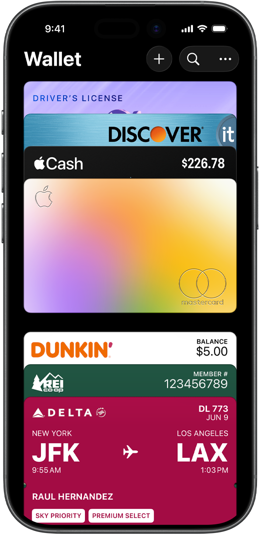 The Wallet app lives right on your iPhone. It’s where you securely keep your credit and debit cards, eligible driver’s license or state ID, transit cards, event tickets, keys, and more — all in one place. And it all works with iPhone or Apple Watch, so you can take less with you but always bring more.